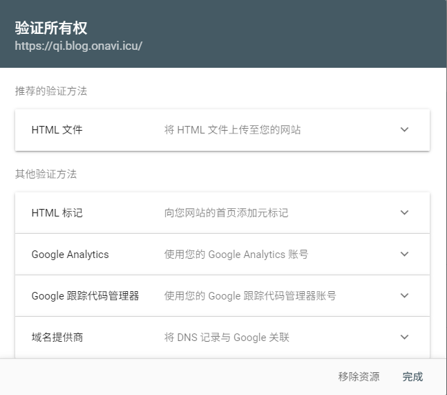 - 添加网站资源 → 验证方式类似必应(HTML 文件/标签/域名验证)