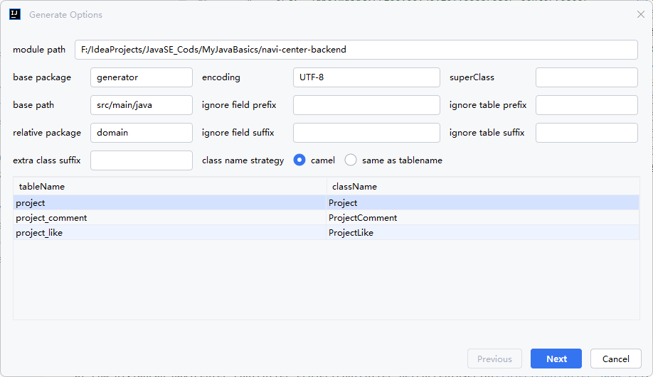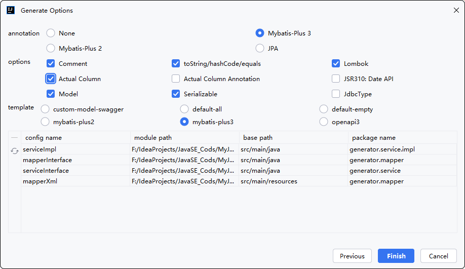 勾选选项:MyBatis-Plus3、Comment(字段注释)、Actual Column(实际字段名)、Model(生成 domain)、Lombok(使用注解)→ Finish。 - 提示:支持多表选择,并可生成到对应的包路径下。